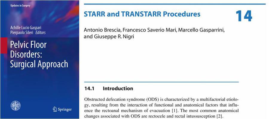 E' stato recentemente pubblicato un libro sulle patologie del pavimento pelvico che mi vede come Autore di un capitolo sulle tecniche chirurgiche di trattamento del prolasso del retto e della sindrome da defecazione ostruita.